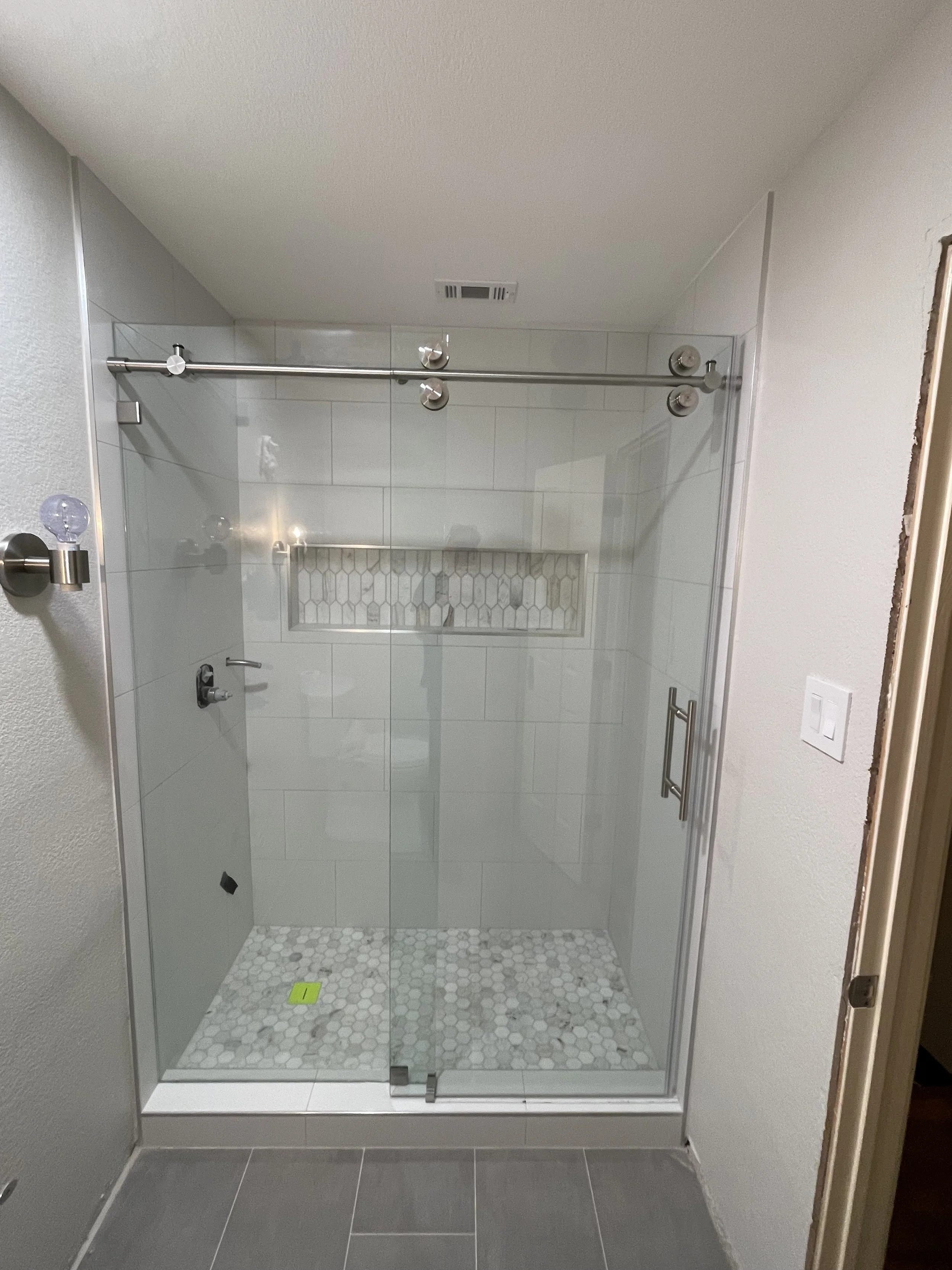 Empty glass shower enclosure with white tile walls, hexagonal tile floor, built-in niche, and sliding glass door.