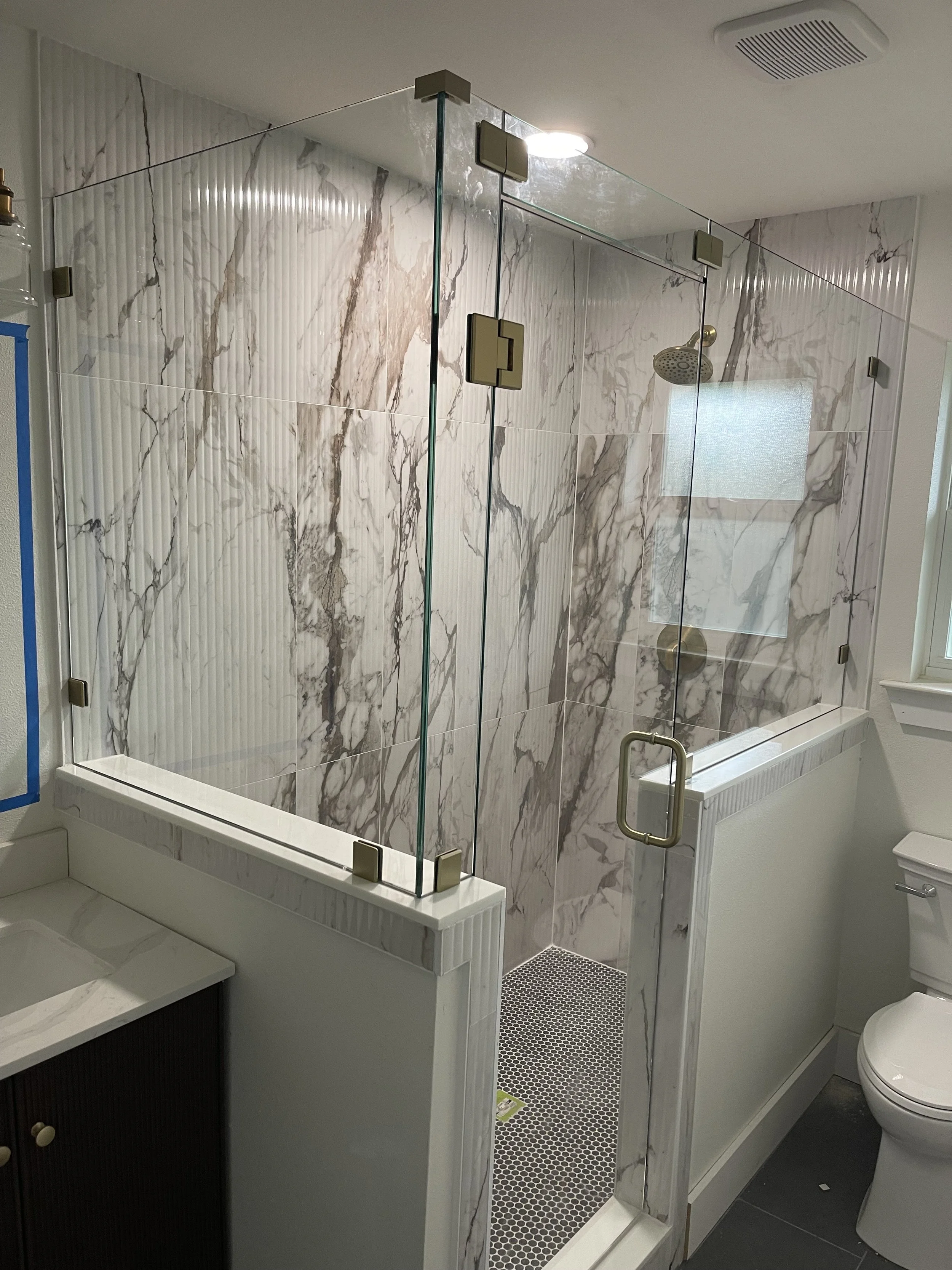 Bathroom with a glass shower enclosure featuring marble tiles, a brass handle on the door, a black vanity with a white marble top, and a white toilet. There is a small window and a ceiling vent.
