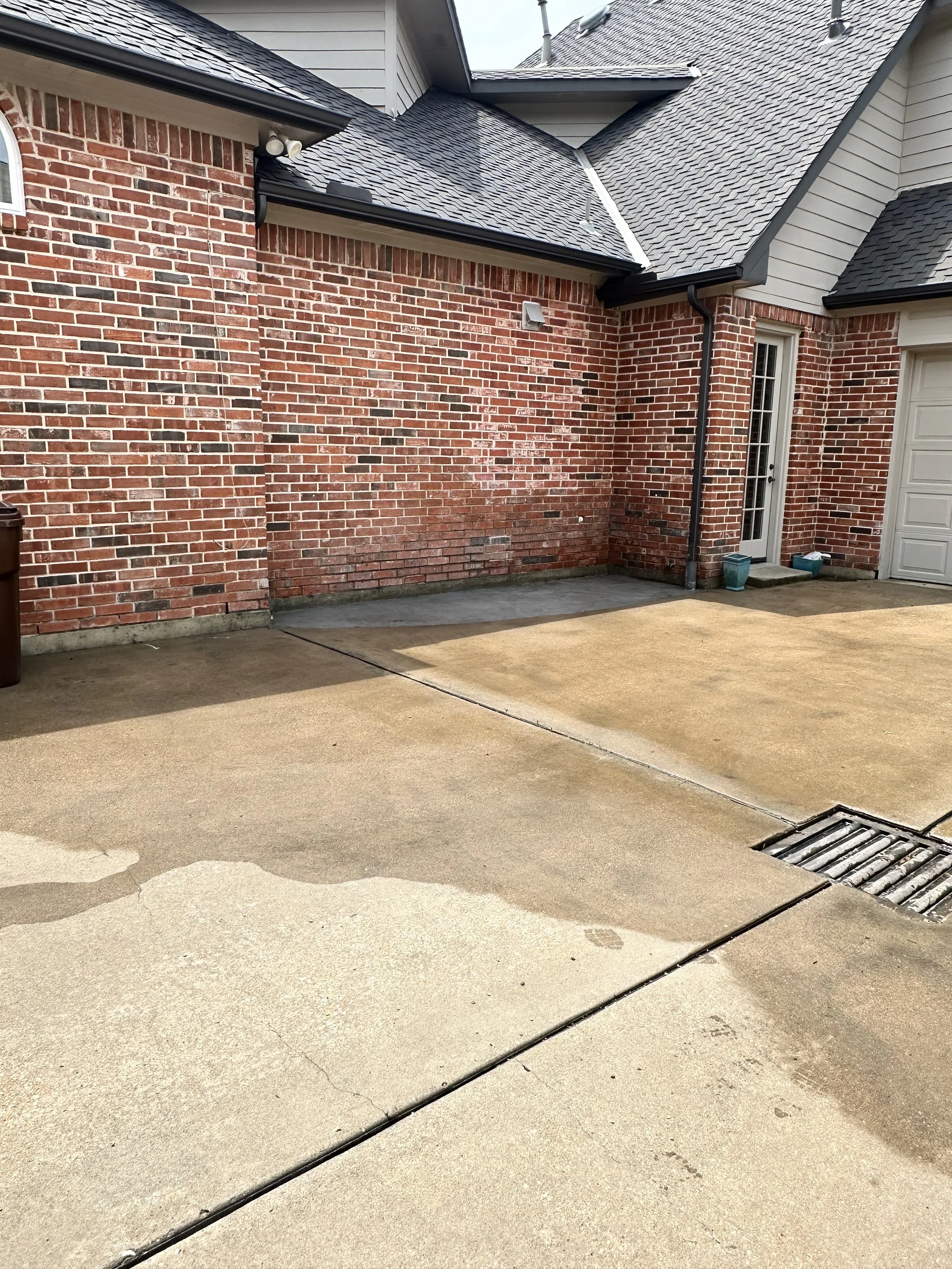 Back porch area of a brick house with concrete and stone pavers, along with a drain grate, and potted plants near a glass door.