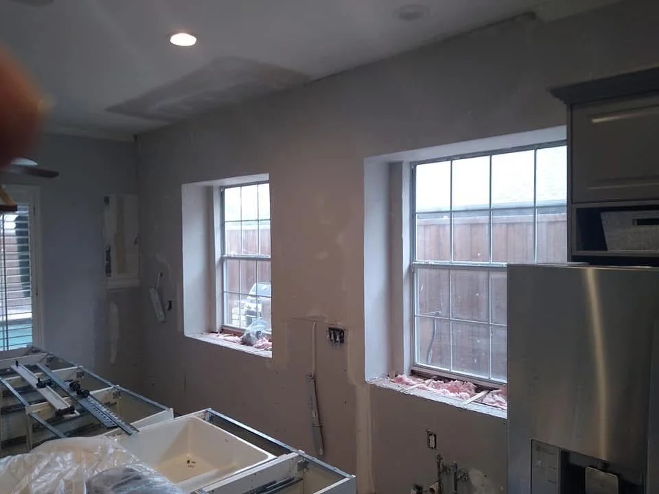Kitchen under renovation with two windows, construction materials, and partially installed cabinets.