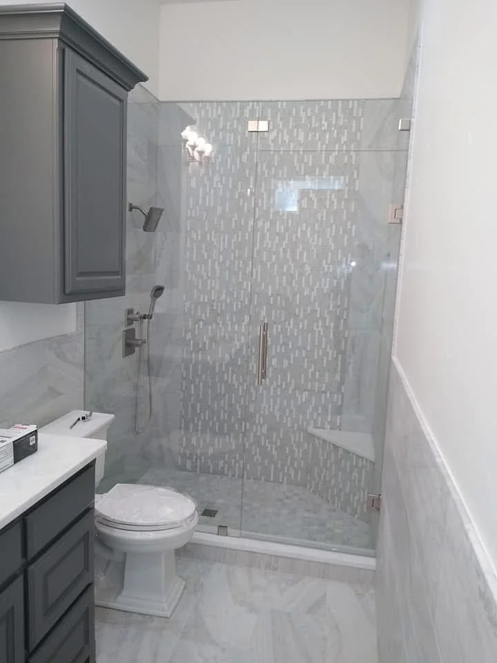 A modern shower area with a glass door and marble tile walls, under construction with tools and debris on the floor.