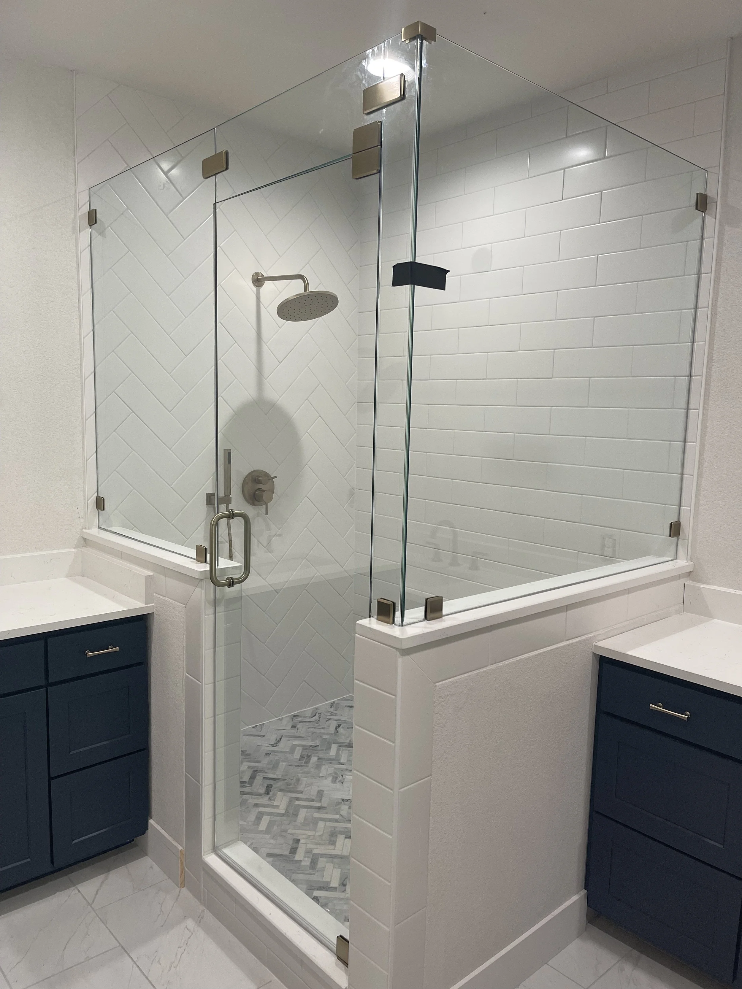 Modern corner glass shower with white subway tiles and a rain shower head, adjacent to blue bathroom vanity with white countertop.