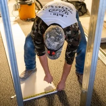 A person in camouflage shorts, a sweat shirt with text on the back, and a cap, is working on a construction project. They are bent over, securing a white panel to a metal frame in an indoor construction site.