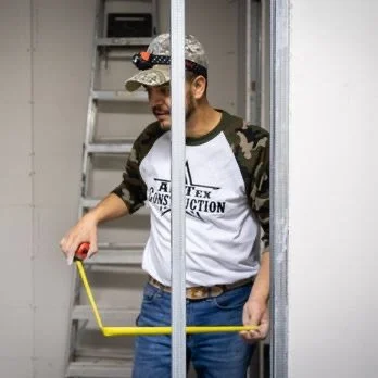 A man wearing a camo shirt and baseball cap is measuring or working on a door frame using a yellow level tool while holding a vertical measuring tape.
